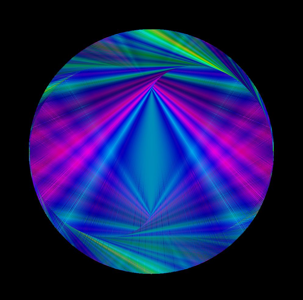 Der auf dieser Seite gezeigte Live-Sketch ist als Animation konzipiert. Bei jedem draw-Durchgang wird nur ein Punktepaar gezeichnet. So kann man den Entstehungsprozess gut beobachten. Wählt man per '+' Taste aber mehr als 720 Punktepaare, so wird die Animation sehr langsam. Um ein lückenloses farbiges Bild einer Epizykloide zu erhalten, sollte man aber mindestens 7200 Punktepaare berechnen lassen. Der Sketch "Epizykloide Schnell" erledigt diese Aufgabe in wenigen Sekunden. Die folgenden drei Bilder sind von oben nach unten: Kardioide, Nephroide und ein Bild mit a=6 und b=2. Danach folgen zwei Epizykloide, bei denen der Radius der beiden Kreise nicht gleich ist (r1=400 und r2=200):