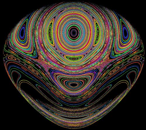 Dies sind allesamt quasiperiodische Bereiche. Die Zentren der Inseln liefern sogar eine periodische Bewegung des