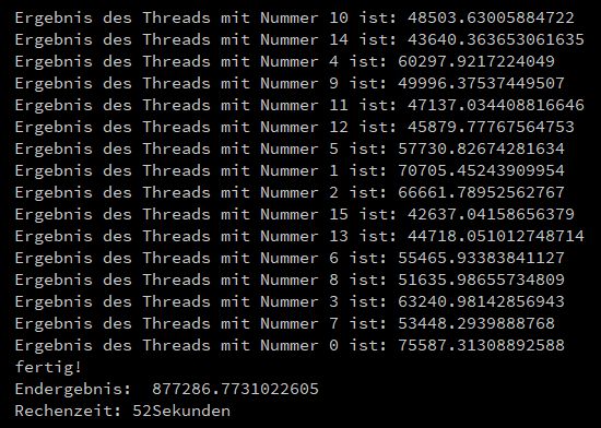 Man kann in obigem Code sehr schön erkennen, dass gewartet wird, bis alle Threads fertig gerechnet haben. Ebenso